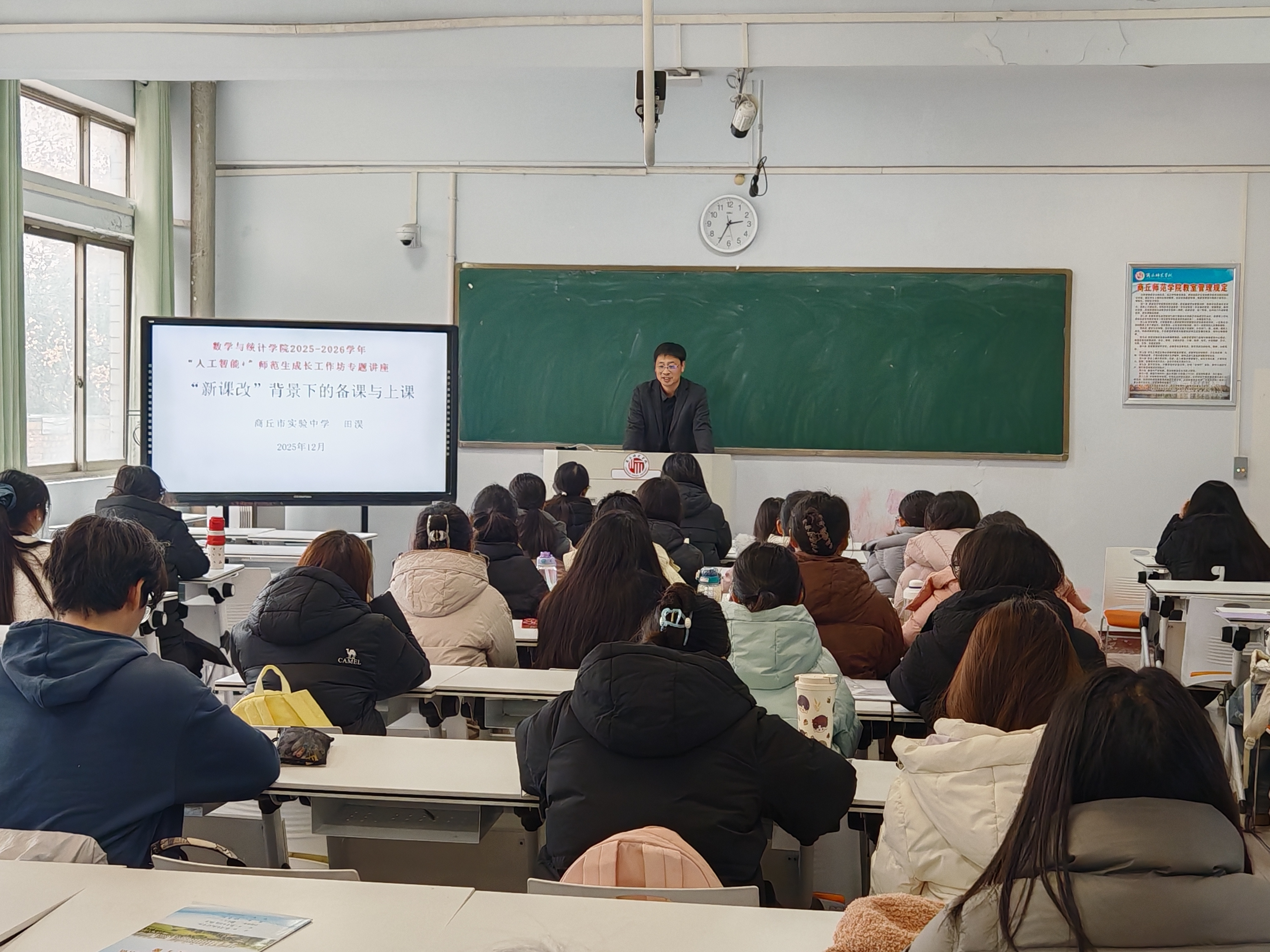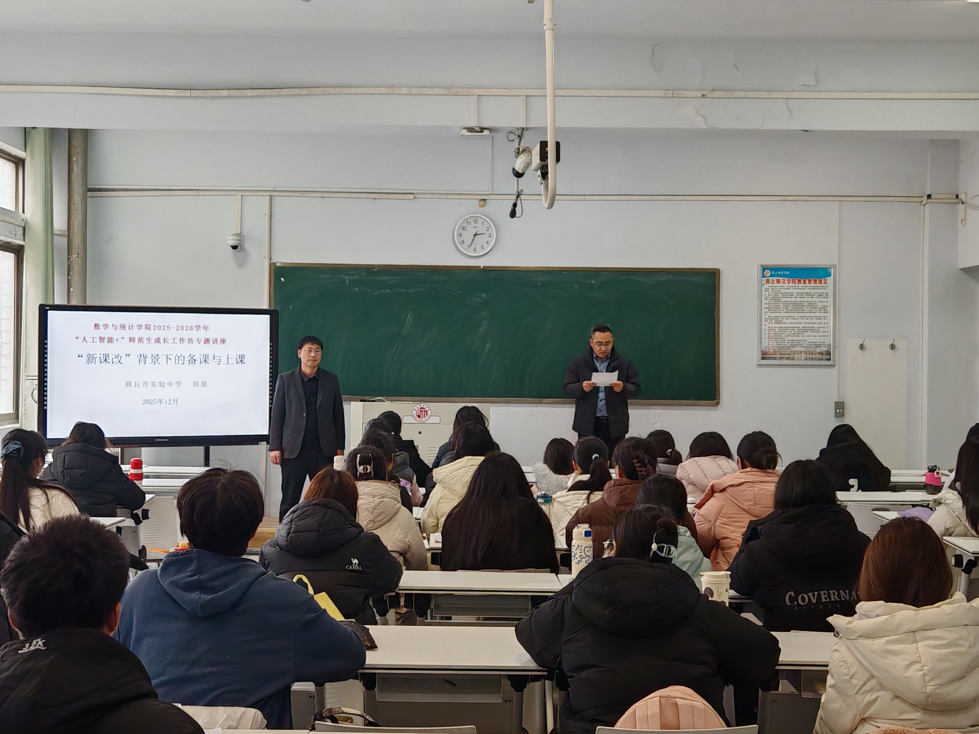 为助力师范生精准把握新课标要求,熟练运用新教材开展教学实践,切实提升备课与上课核心技能,yl23455永利于12月23日下午在睢阳校区一号教学楼209教室开展了以“‘新课改’背景下的备课与上课”为主题的“人工智能+”中学数学师范生技能培训工作坊第二次集中培训。此次培训由yl23455永利副院长任磊主持,商丘市实验中学高级教师田淏讲授,数学与应用数学系主任司红颖及全体工作坊坊员参加。