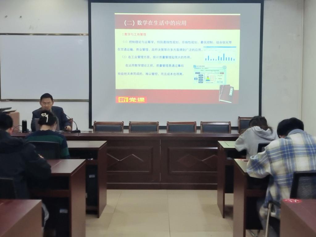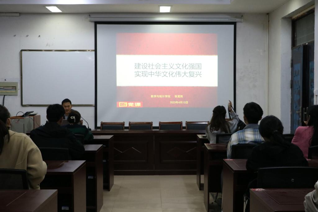 课上,张斐然院长从为什么要建设社会主义文化强国、建设社会主义文化强国的目标和任务、建设社会主义文化强国的重点举措、数学与文化四部分对党课内容进行了解读。张院长结合学生数学专业背景和自身入党经历,通过丰富详实的案例,为中级入党积极分子上了一场生动、深刻的党课。培训的最后,张斐然院长鼓励号召入党积极分子们听党话、跟党走,不断发展和完善自身的能力,提升自身专业素养,把自身专业知识应用于国家建设的各个方面,为中华民族伟大复兴贡献自己的力量。