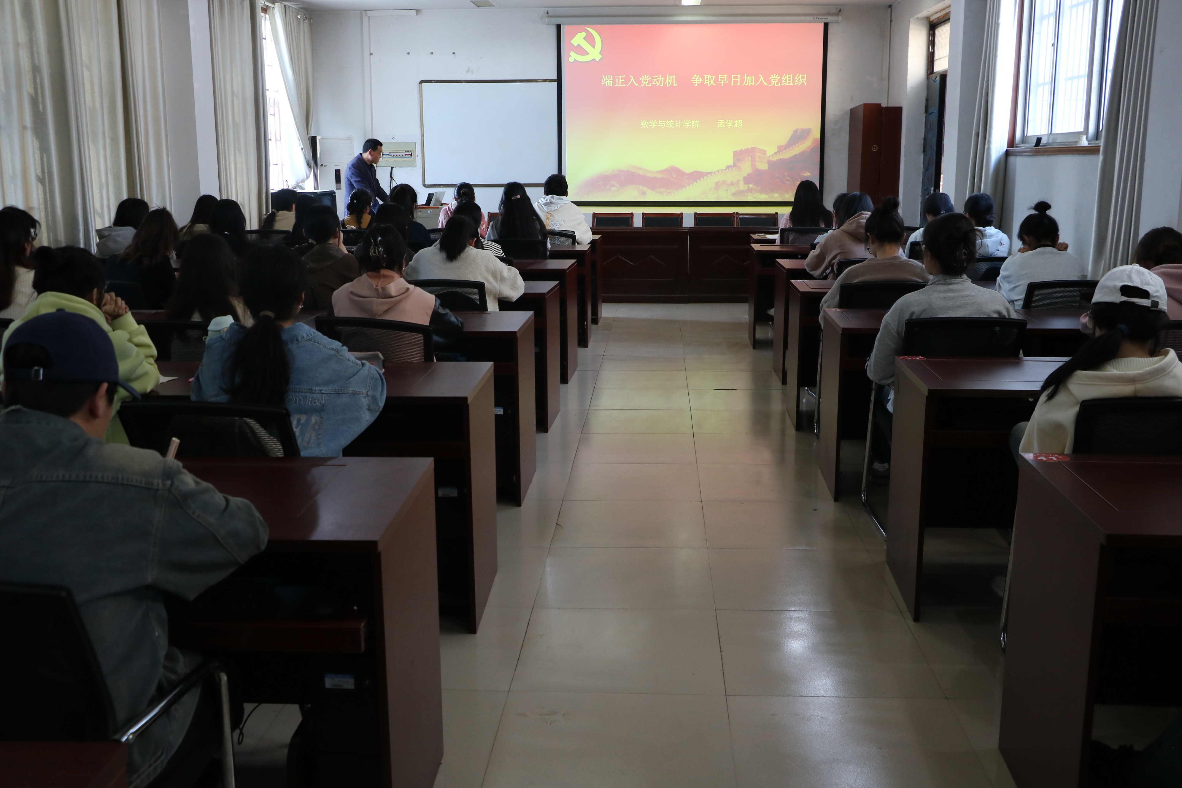 为切实做好入党积极分子的培养教育,确保新党员发展的质量。根据学校党委组织部的工作部署,3月29日,yl23455永利分党校在数学办公楼208教室开展了以“端正入党动机,争取早日加入党组织”为主题的党课培训。本次党课由党委书记孟学超主讲,全体中级入党积极分子参加。