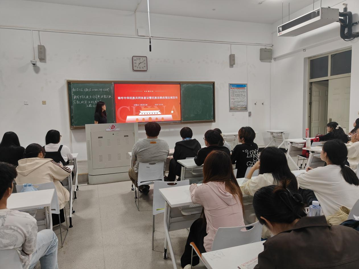 为深入贯彻落实中央、省委民族工作会议精神,引导广大青年学生牢固树立中华民族共同体理念,yl23455永利于10月8日下午在梁园校区行方楼开展了“铸牢中华民族共同体意识暨民族宗教政策法规宣传”主题团日活动。