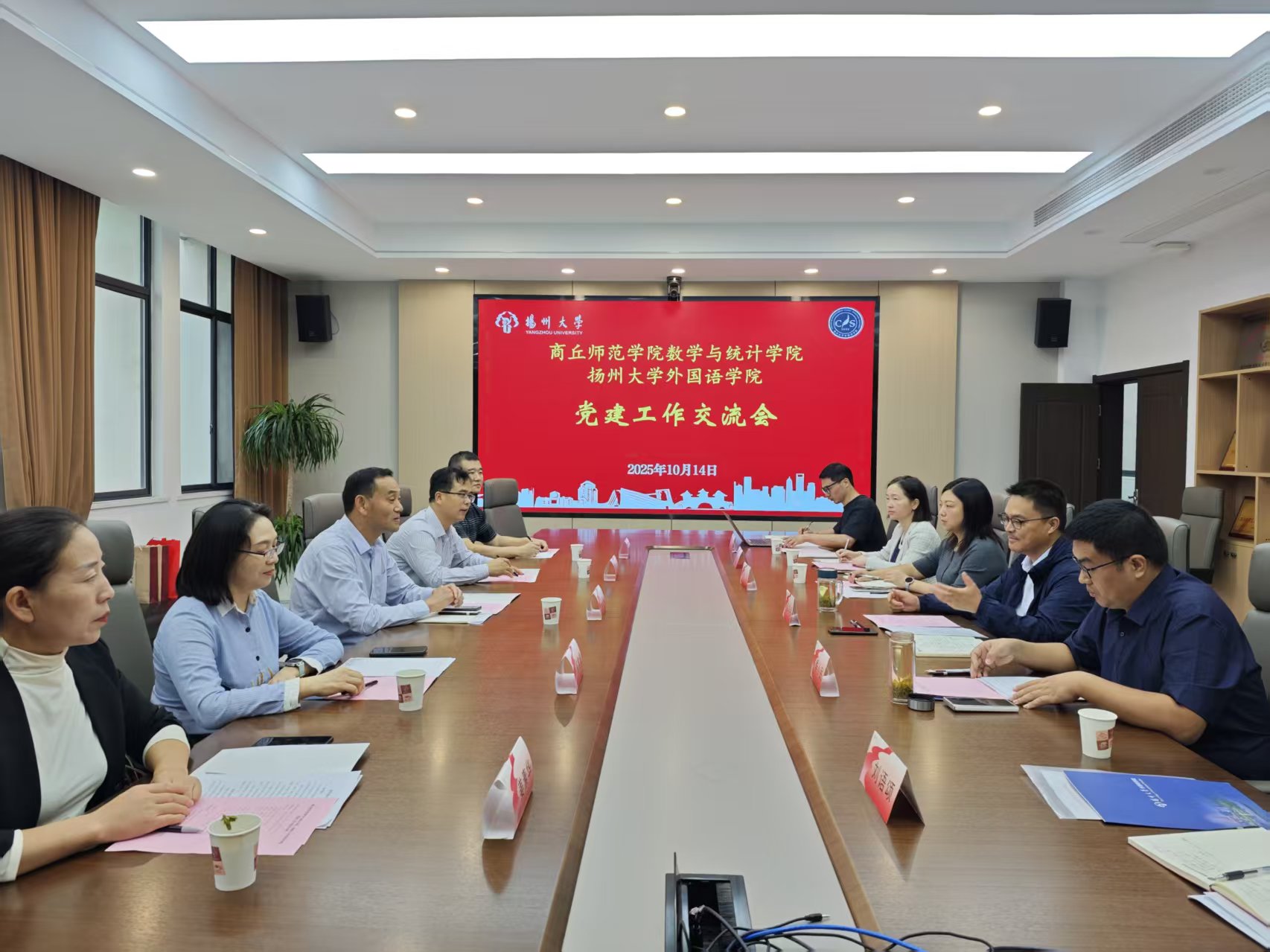 10月14日,我院党委一行在党委书记孟学超带领下,赴扬州大学外国语学院开展党建工作交流学习。党政办公室主任张钦富及党支部书记代表共同参加。扬州大学外国语学院党委书记居学明对我院一行予以热情接待。